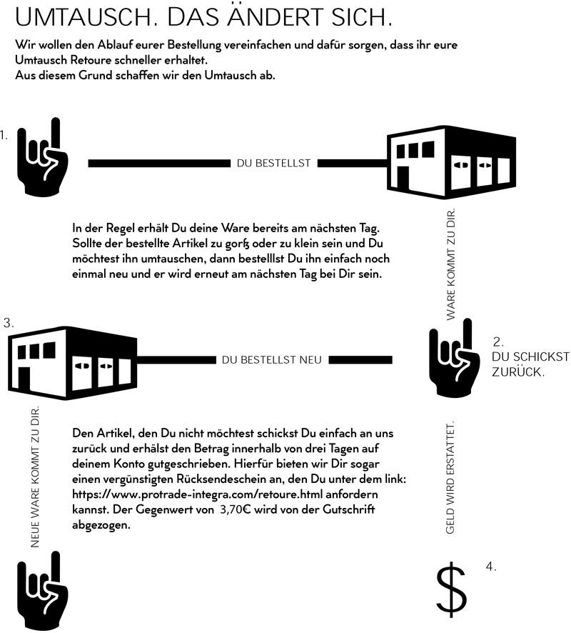 Zukünftig werden zurückgesendete Waren pauschal zurückerstattet, statt diese umzutauschen. Sollte ein Umtausch in eine andere Größe gewünscht sein, so muss diese erneut über den Onlineshop bestellt und bezahlt werden.